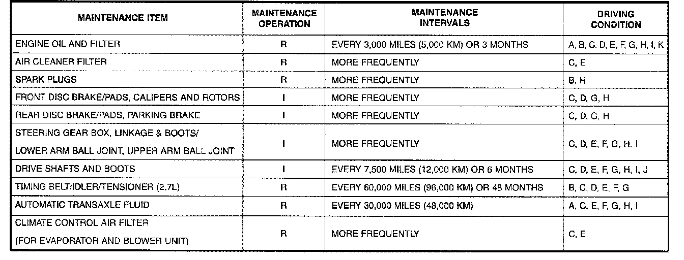 R: Replace. I: Inspect and, after inspection, clean, adjust, repair or replace if necessary.