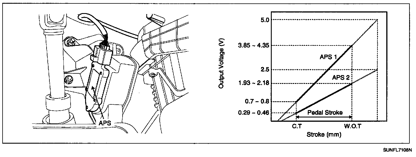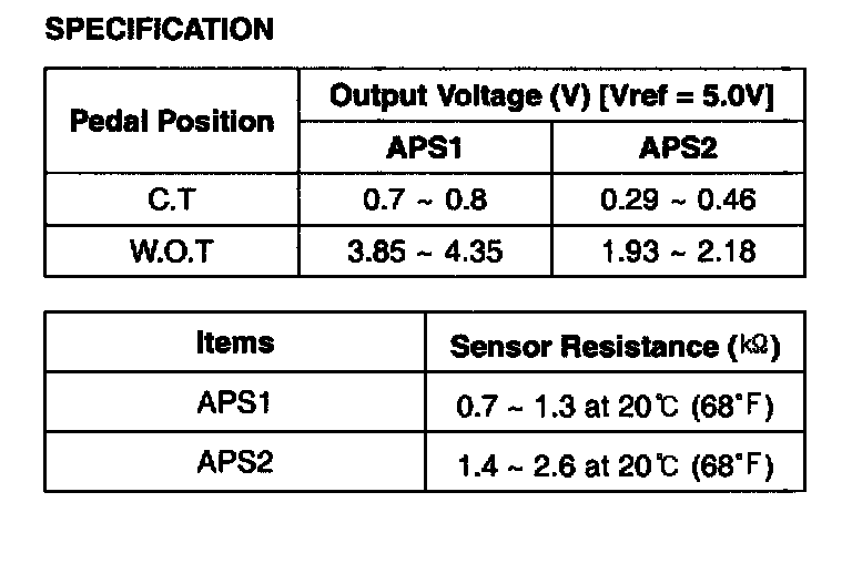 Accelerator Position Sensor (APS) is installed on the accelerator pedal module and detects the rotation angle of the accelerator pedal. The APS is one of the most important sensors in engine control system so it consists of the two sensors which adapt individual sensor power and ground line. The second sensor monitors the first sensor and its output voltage is half of the first one. If the ratio of the sensor 1 and 2 is out of the range (approximately 1/2), the diagnostic system judges that it is abnormal.