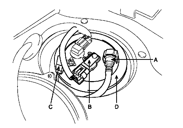 2. Disconnect the fuel feed tube quick-connector (A), the fuel tank pressure sensor connector (B), and the canister close valve connector (C).