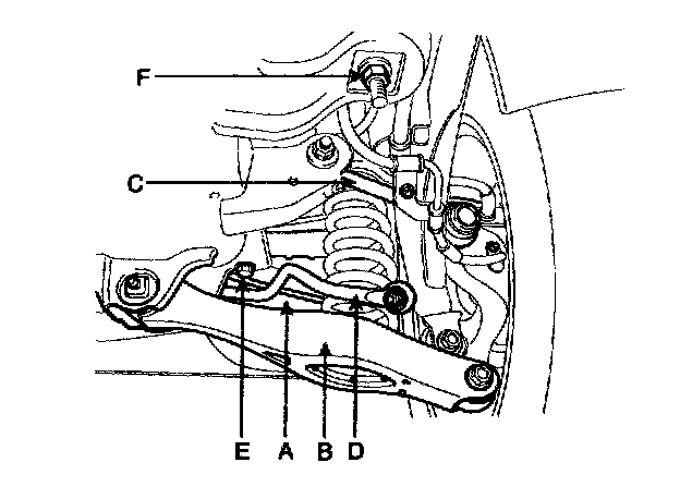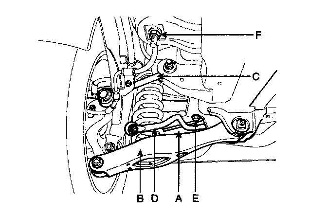 7. Remove the upper arm (A), the lower arm (B), the assist arm (C), and the stabilizer bar (D) from the fuel tank & suspension member assembly.