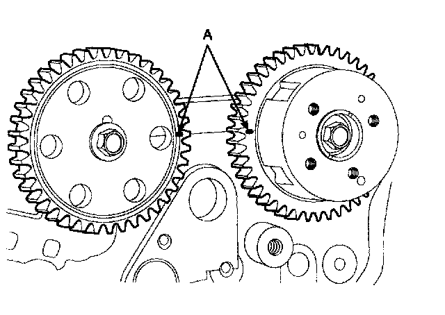 2) Check that the mark(A) of the camshaft timing sprockets are in straight line on the cylinder head surface as shown in the illustration.