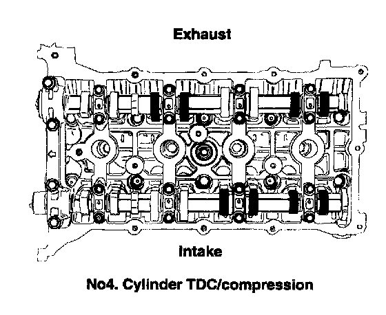 3) Check only valves indicated as shown. [NO. 4 cylinder: TDC/compression]. Measure the valve clearance.
