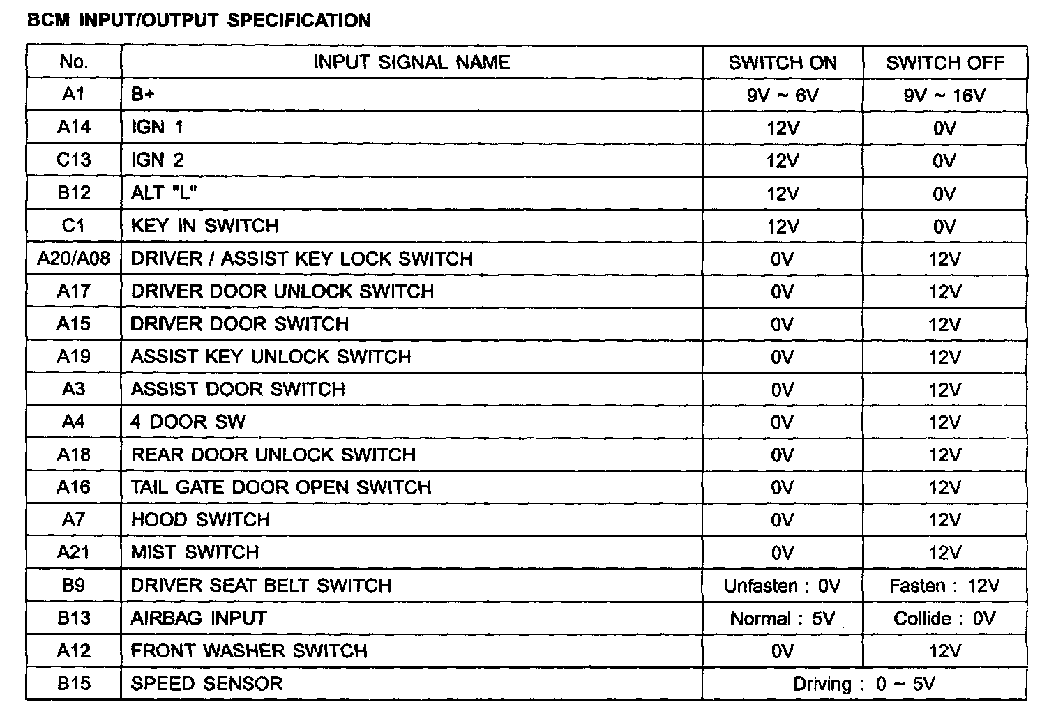 BCM Input/Output Specification: