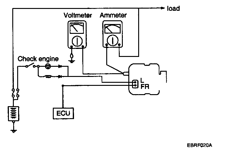 1. Check to see that the voltmeter reads as the same value as the battery voltage. If the voltmeter reads 0 V, and the open circuit in the wire between alternator "B" terminal and battery (-) terminal or poor grounding is suspected.