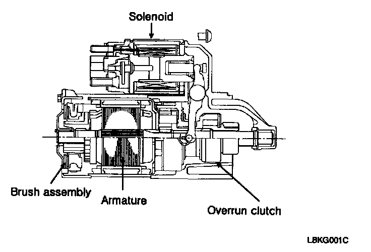 The contacts close and the starter motor cranks. In order to prevent damage caused by excessive rotation of the starter armature when the engine starts, the clutch pinion gear overruns.
