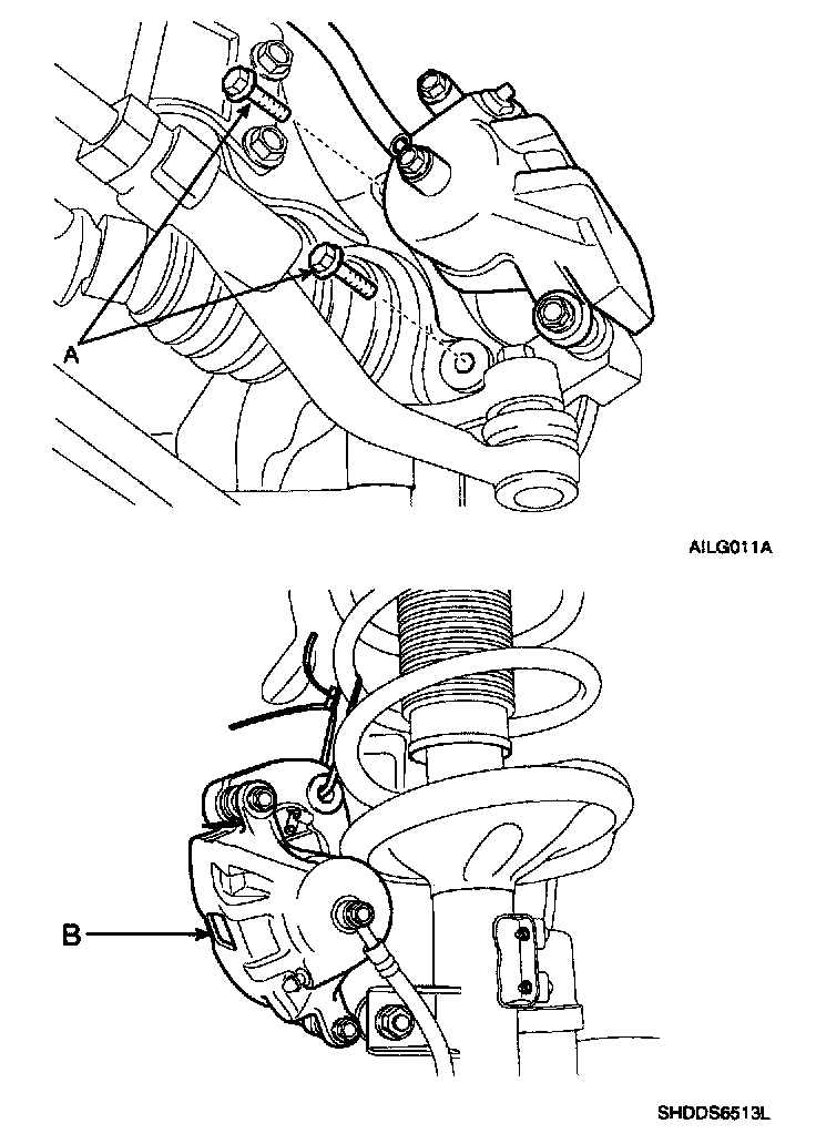 4. Remove the brake caliper mounting bolts (A), and then place the brake caliper assembly (B) with wire.