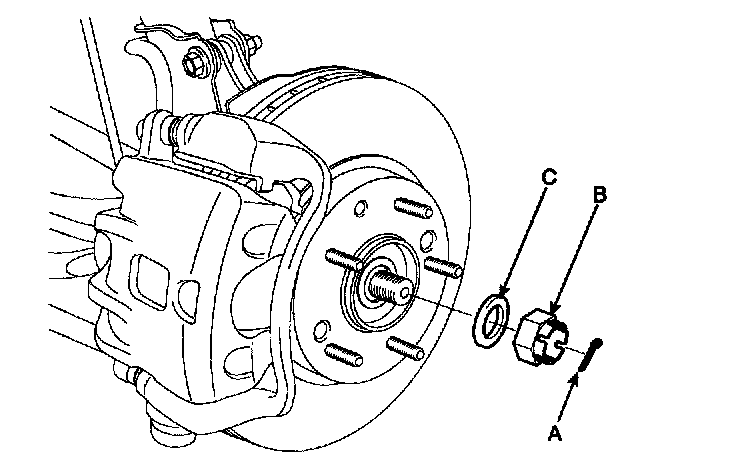 5. Remove the split pin (A), then remove castle nut (B) and washer (C) from the front hub under applying the brake.