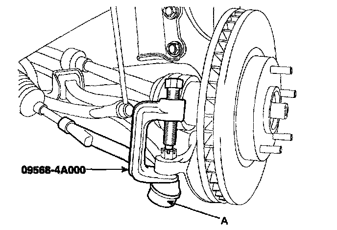 2) Disconnect the ball joint (A) from knuckle by using the special tool (09568-4A000).