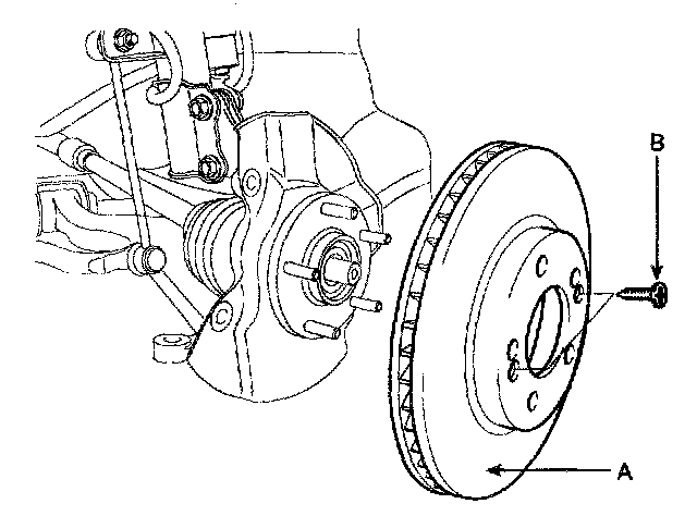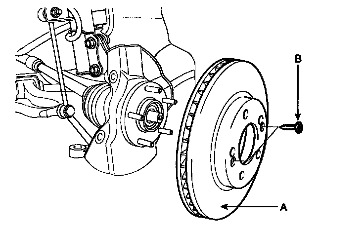 8. Remove the brake disc (A) from the front hub assembly after remove the screws (B).