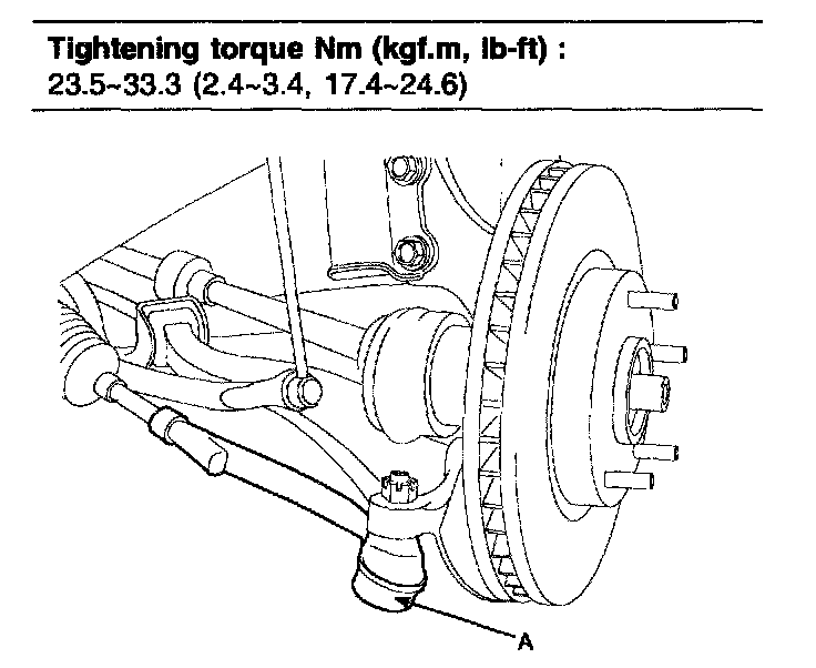 4. Install the tie rod end ball joint (A) to the knuckle.