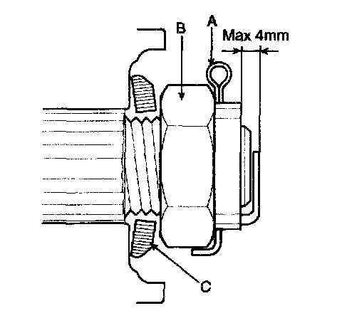 7. Install the washer (C), castle nut (B) and new split pin (A) to the front hub assembly.
