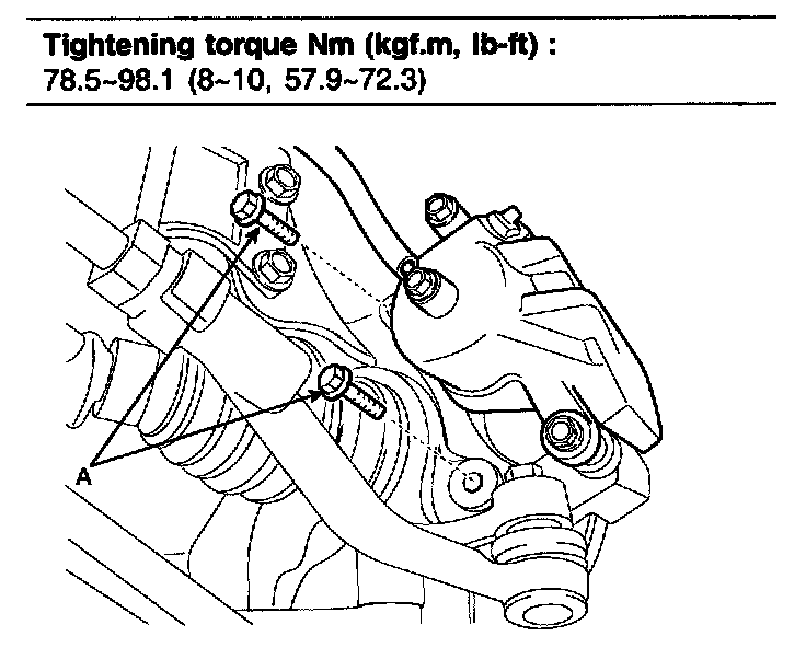 8. Install the brake caliper and then tighten the mounting bolts(A).