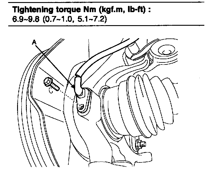 6. Install the ball joint assembly mounting bolt (A) to the knuckle.