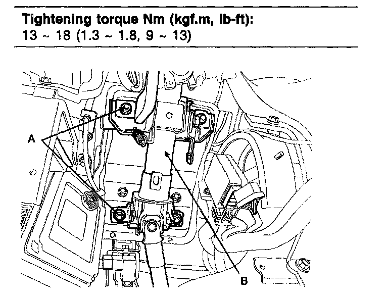 1. Install the steering column & universal joint assembly (B) by tightening the mounting bolts and nuts (A).