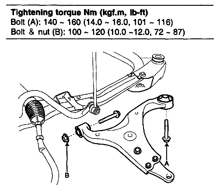 1. Install the front lower arm to the sub-frame and then tighten the bolts (A, B) and nut.