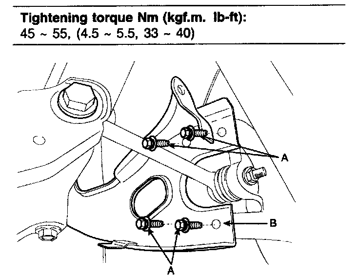 1. Install the rear trailing arm (A) to the body by tightening the mounting bolts (B).