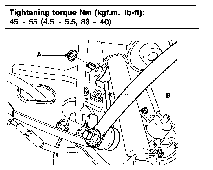 3. Connect the rear stabilizer link (B) with the trailing arm and tighten the nut (A).