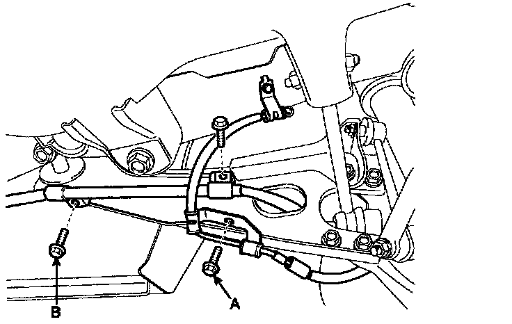 5. Install the wheel speed sensor and parking brake cable bracket by tightening the mounting bolts (A, B).