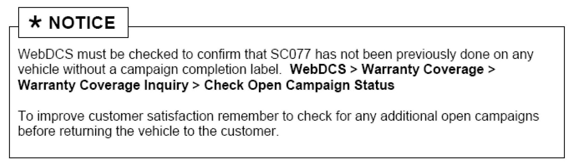 Open the hood and check for a campaign completion label on the driver's side inner fender as shown here.