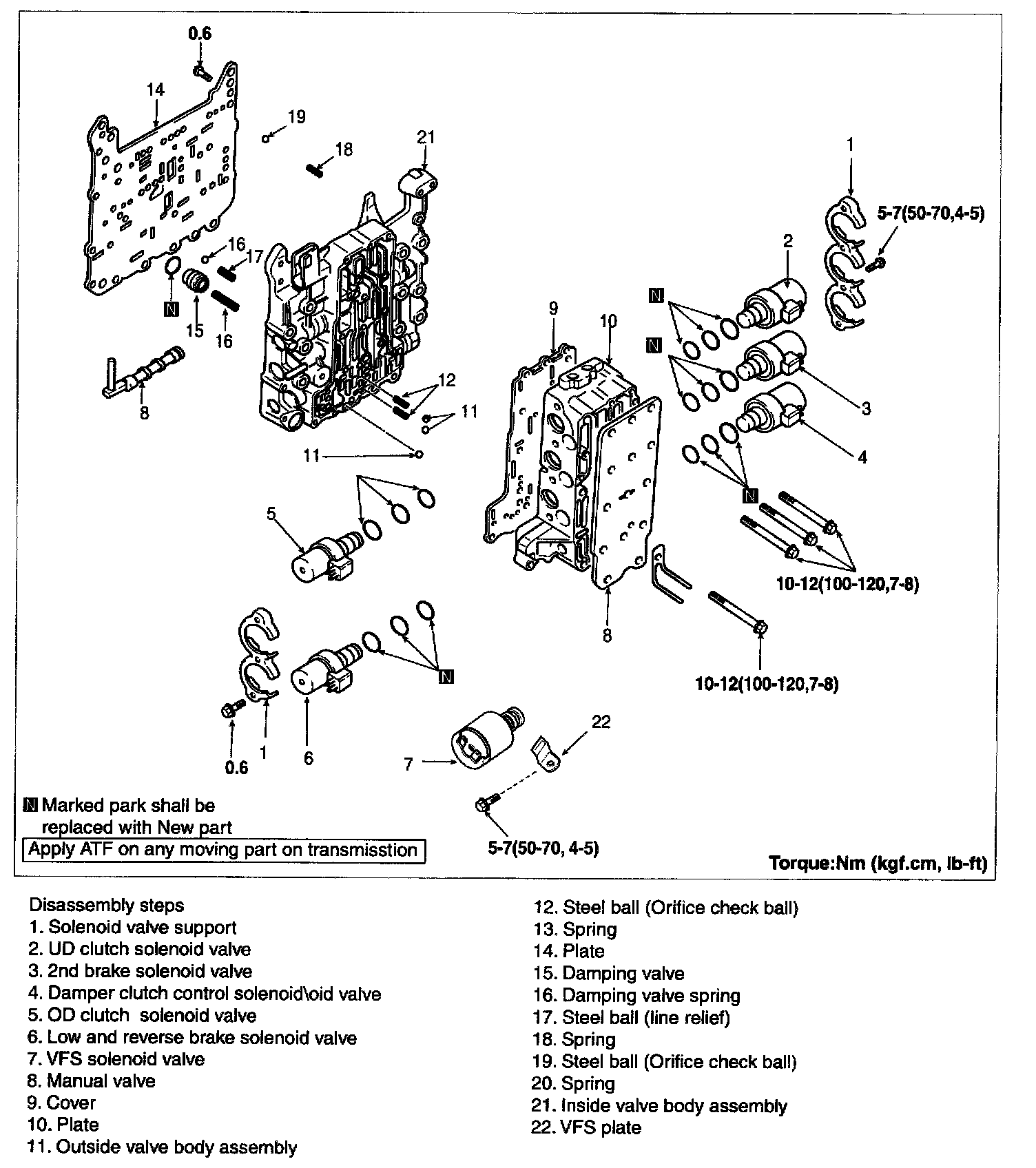 Under the constant current amount of VFS (200mA), the line pressure will become as below table. Be sure that the following data can be achieved by specific special facility or device to check the performance of A assembly (not on the vehicle), however we can refer the maximum pressure value according to each element.