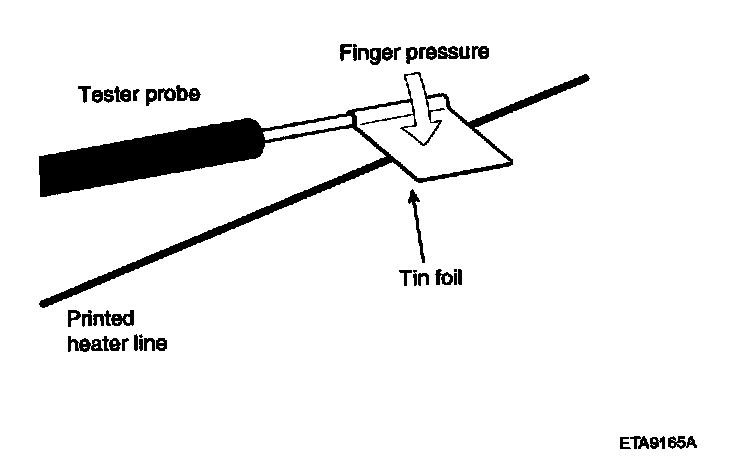 CAUTION: Wrap tin foil around the end of the voltmeter test lead to prevent damaging the heater line. Apply finger pressure on the tin foil, moving the tin foil along the grid line to check for open circuits.