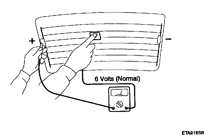 1. Turn on the defogger switch and use a voltmeter to measure the voltage of each heater line at the glass center point. If a voltage of approximately 6 V is indicated by the voltmeter, the heater line of the rear window is considered satisfactory.