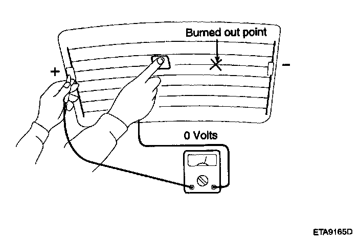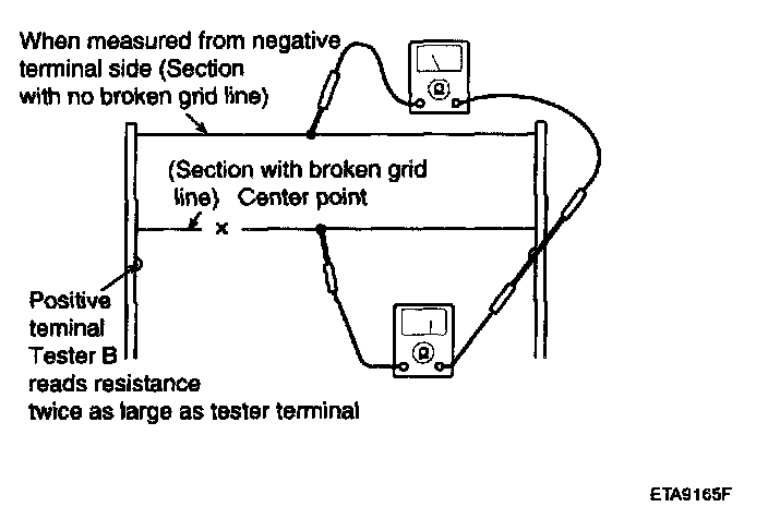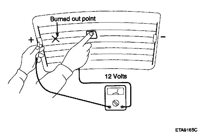 5. Use an ohmmeter to measure the resistance of each heater line between a terminal and the center of a grid line, and between the same terminal and the center of one adjacent heater line. The section with a broken heater line will have a resistance twice as that in other sections. In the affected section, move the test lead to a position where the resistance sharply changes.
