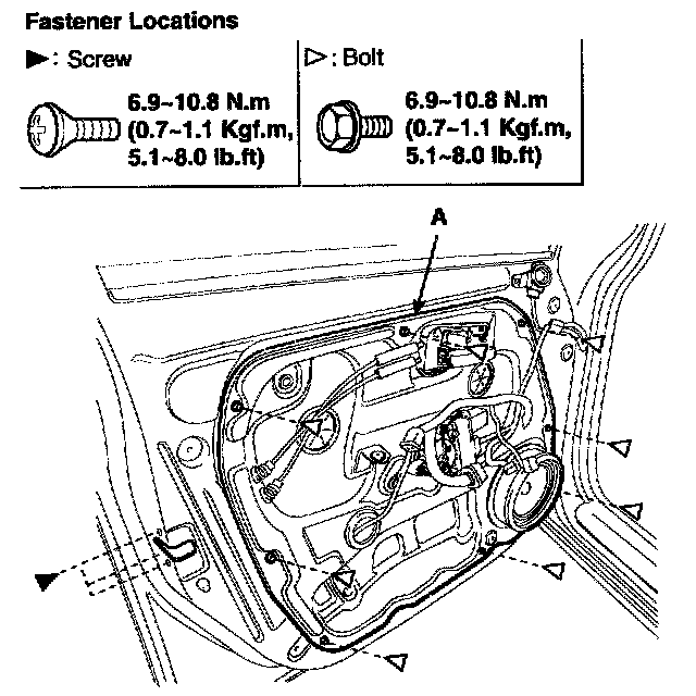 3. Loosen the door module mounting bolts, then remove the door module (A).