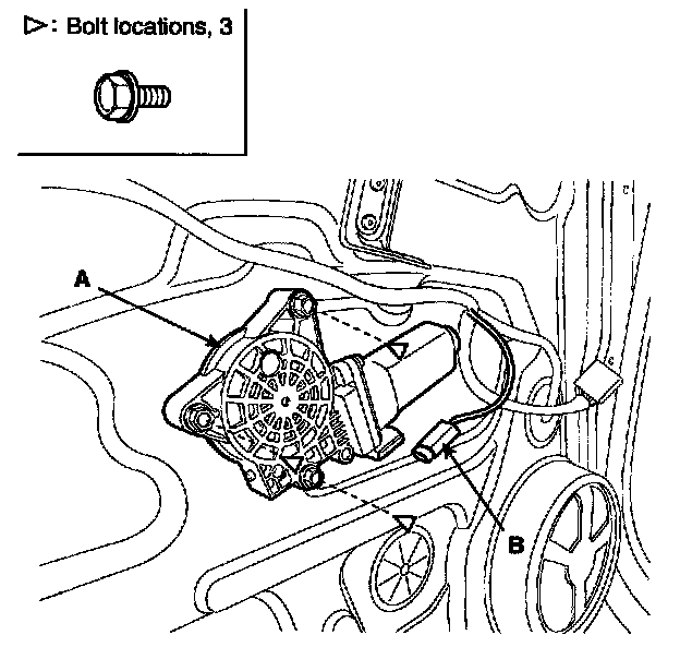 2. After disconnecting the connector (A), remove the power window motor (B).