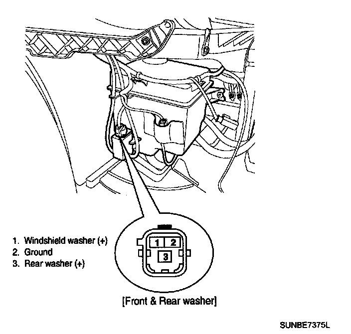 3. Connect positive (+) and negative (-) battery cables to terminals 3 and 2 respectively to see that the washer motor runs and water is pumped.