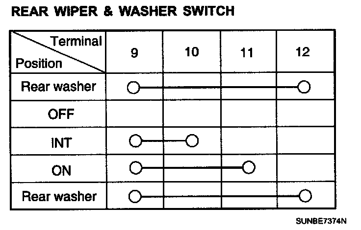 1. With the rear wiper & washer switch in each position, make sure that continuity exists between the terminals. If continuity is not as specified, replace the multifunction switch.