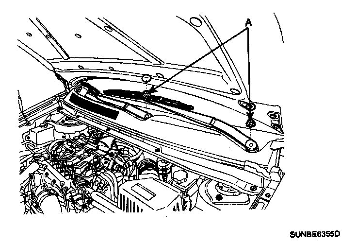 1. Remove the windshield wiper arm and blade after removing a nut (A).