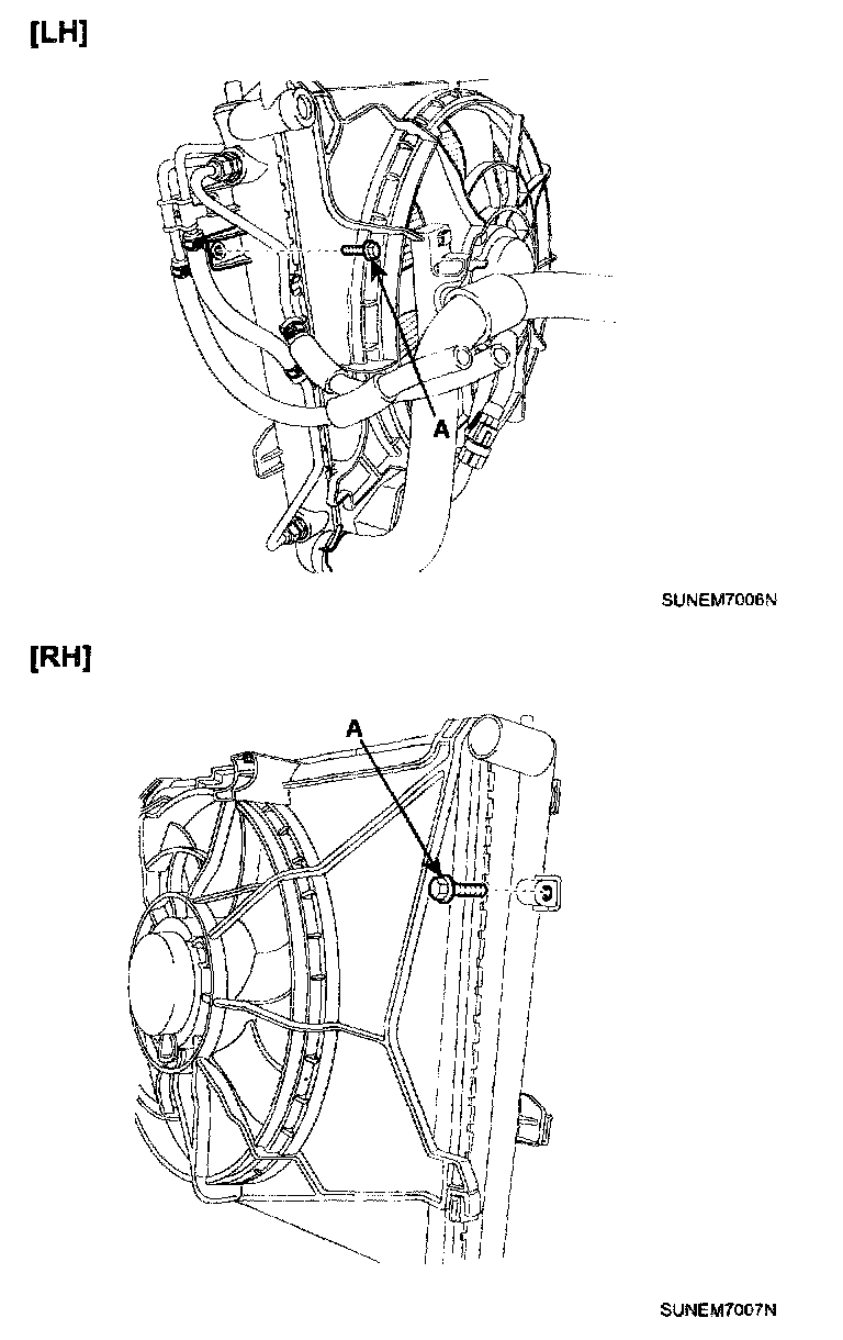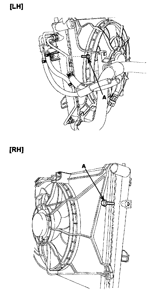 8. Remove the radiator bracket(A) mounting bolt and coolant bleed hose(B).