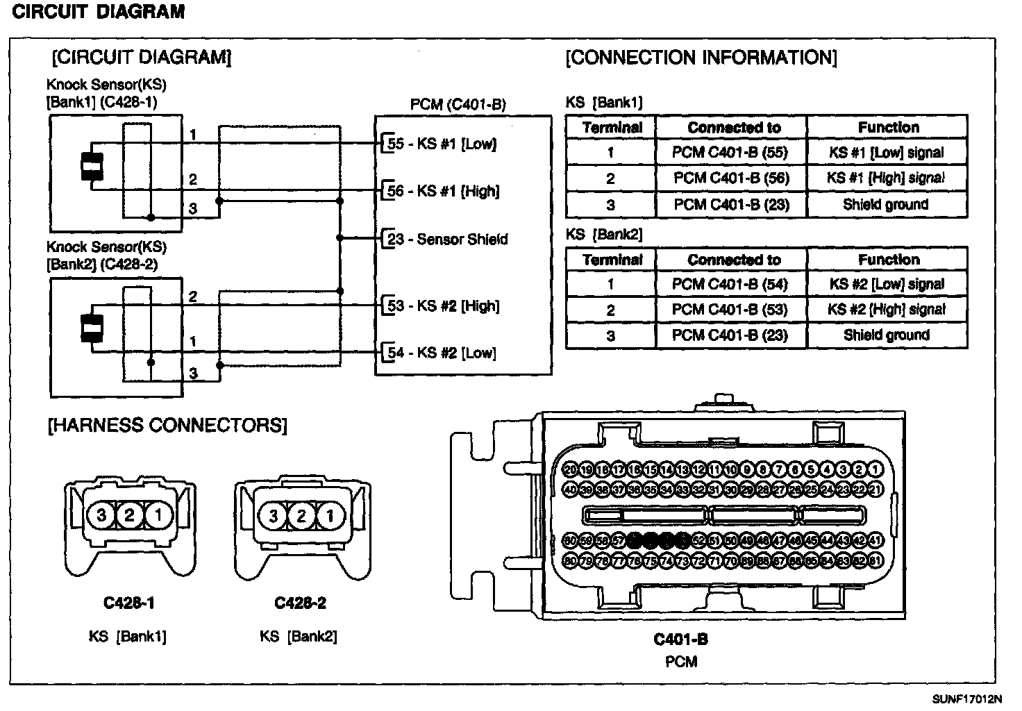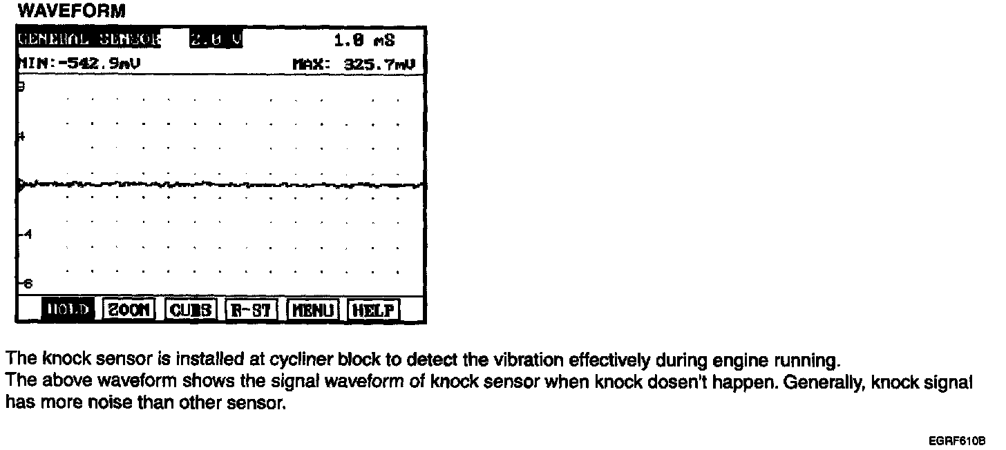 Knocking is a phenomenon characterized by undesirable vibration and noise and can cause engine damage. Knock Sensor (KS) senses engine knocking and the two sensors are installed inside the V-valley of the cylinder block. When knocking occurs, the vibration from the cylinder block is applied as pressure to the piezoelectric element. At this time, this sensor transfers the voltage signal higher than the specified value to the PCM and the PCM retards the ignition timing. If the knocking disappears after retarding the ignition timing, the PCM will advance the ignition timing. This sequential control can improve engine power, torque and fuel economy.