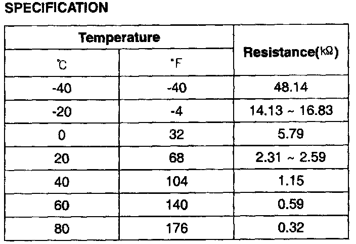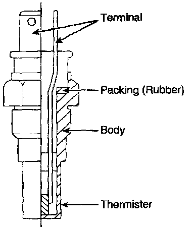 passage of the cylinder head for detecting the engine coolant temperature. The ECTS uses a thermistor whose resistance changes with the temperature. The electrical resistance of the ECTS decreases as the temperature increases, and increases as the temperature decreases. The reference 5 V in the PCM is supplied to the ECTS via a resistor in the PCM.That is, the resistor in the PCM and the thermistor in the ECTS are connected in series. When the resistance value of the thermistor in the ECTS changes according to the engine coolant temperature, the output voltage also changes. During cold engine operation the PCM increases the fuel injection duration and controls the ignition timing using the information of engine coolant temperature to avoid engine stalling and improve driveablity.