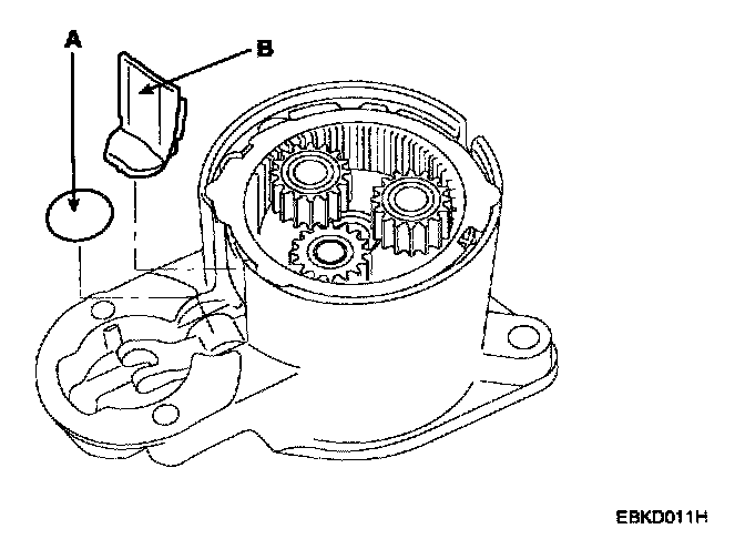 11. Disconnect the stop ring (A), overrunning clutch (B), internal gear (C) and planet shaft (D).