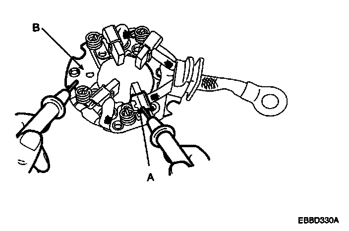 1. Check that mere is no continuity between the (+) brush holder (A) and (-) brush holder (B). If there is no continuity, replace the brush holder assembly.