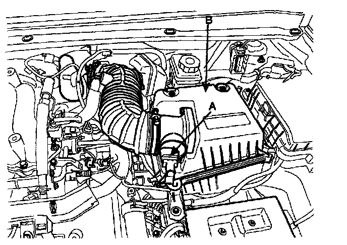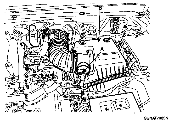 5. After disconnecting the AFS connector (A) and removing the air cleaner upper body (B).