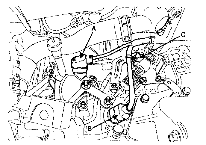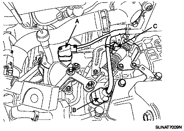 9. Disconnect the inhibitor switch connector (A), solenoid valve connector (B) and the input shaft speed sensor connector (C).