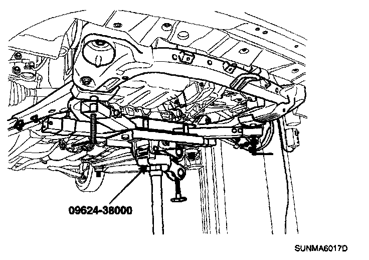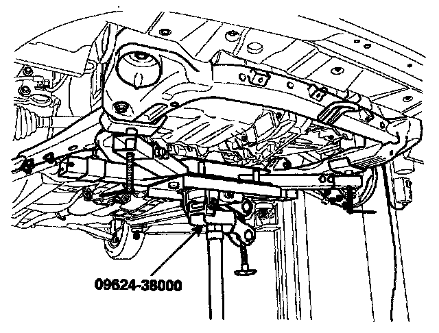 9. Supporting the sub frame with a jack and the special tool (09624-38000), install the mounting bolts.
