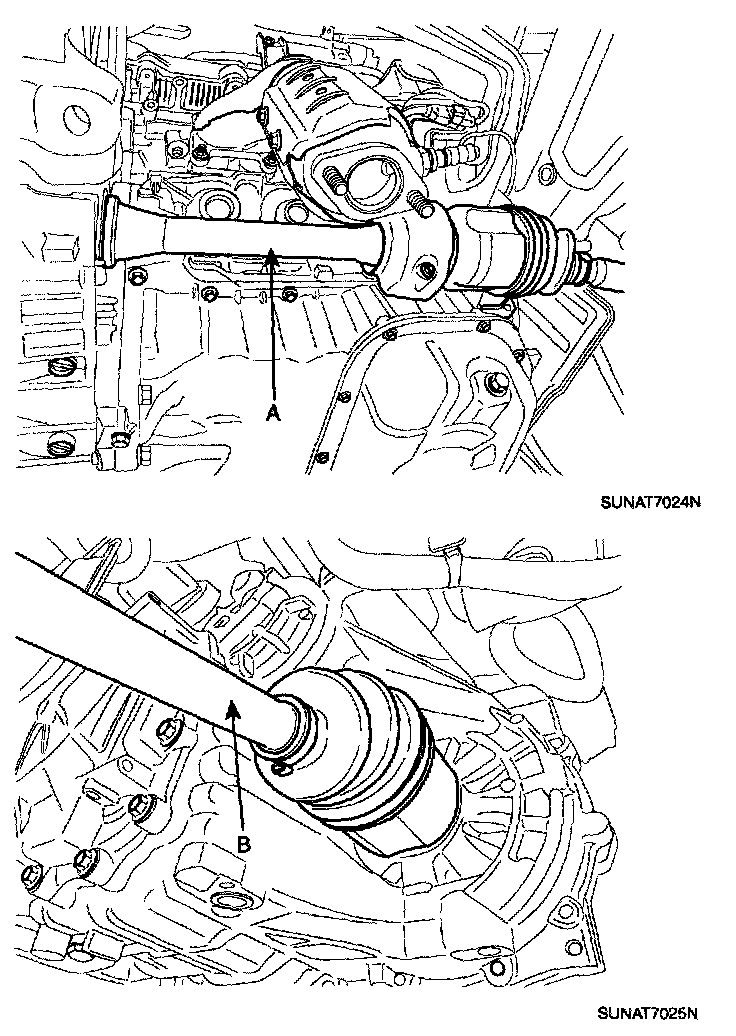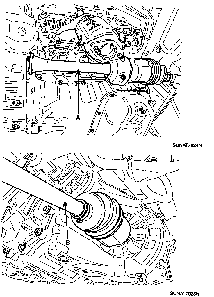 29. Remove drive shaft (A, B) from transaxle.