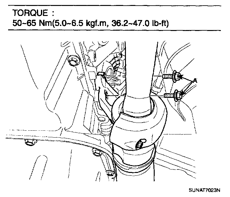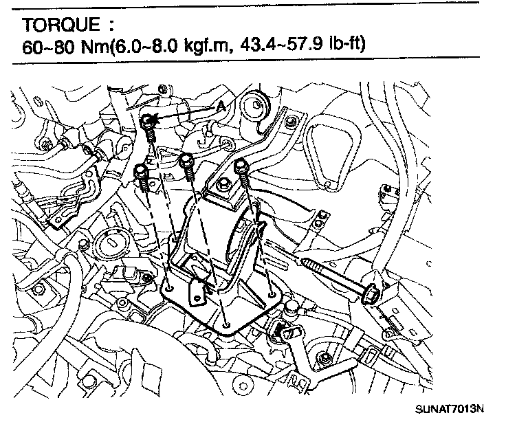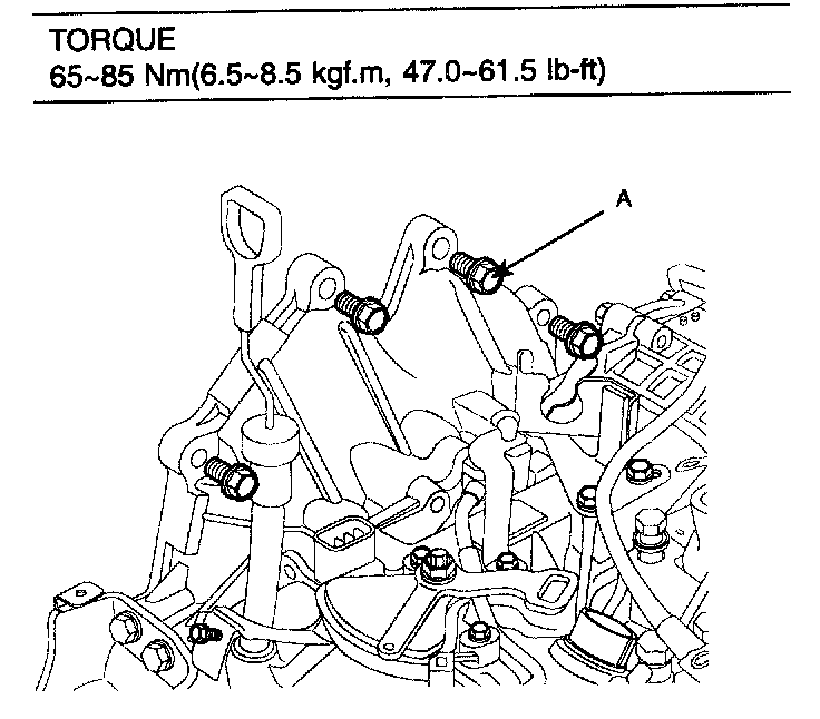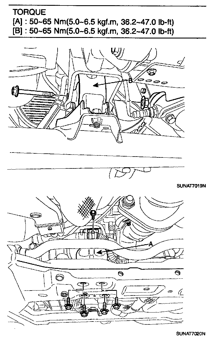 1. Lifting up the transaxle slowly with a jack, tighten the under mounting bolts.