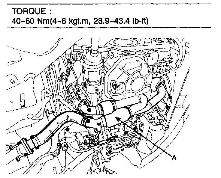 19. Drain power steering fluid through the return tube by loosening the clamp (A).