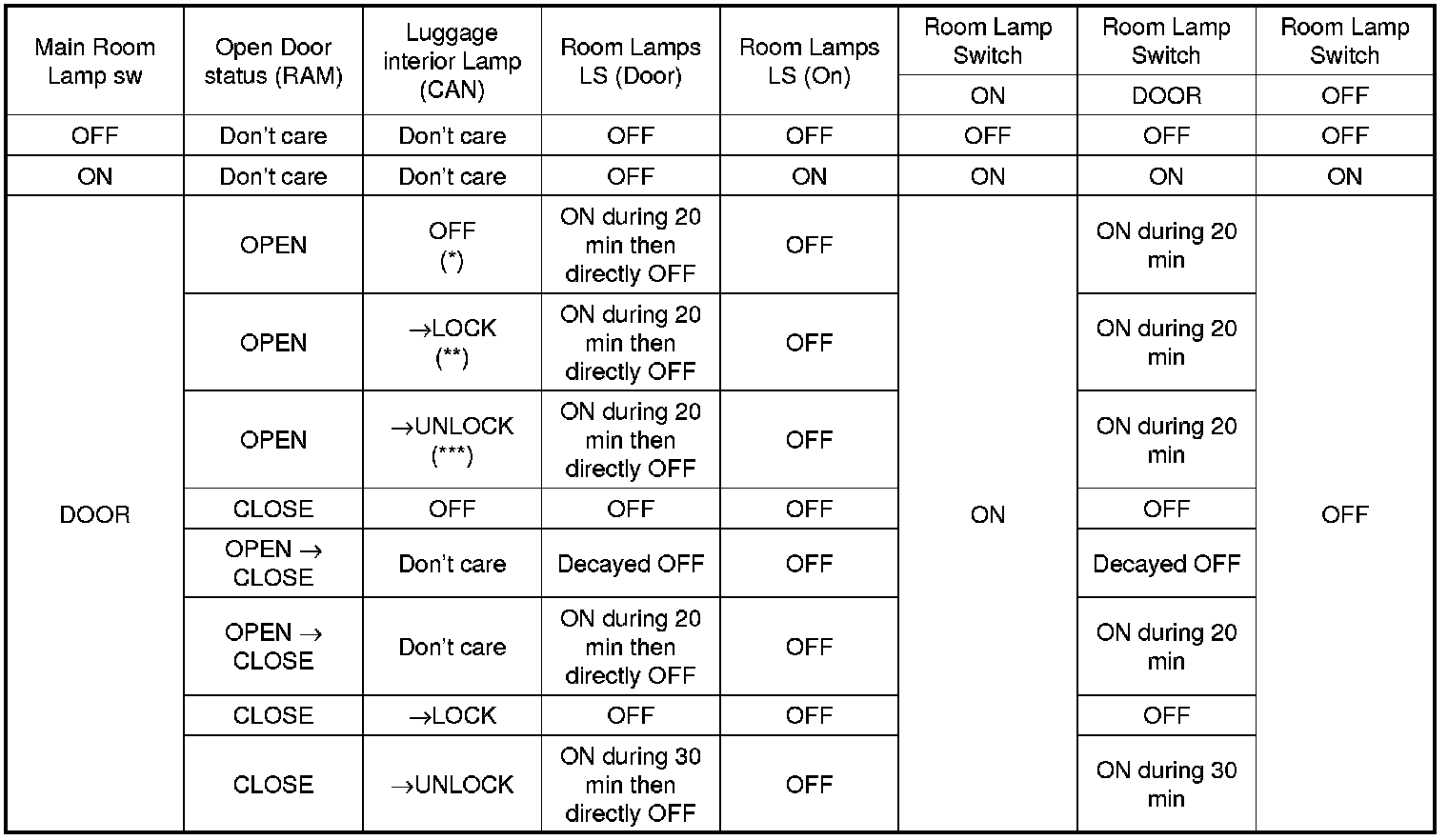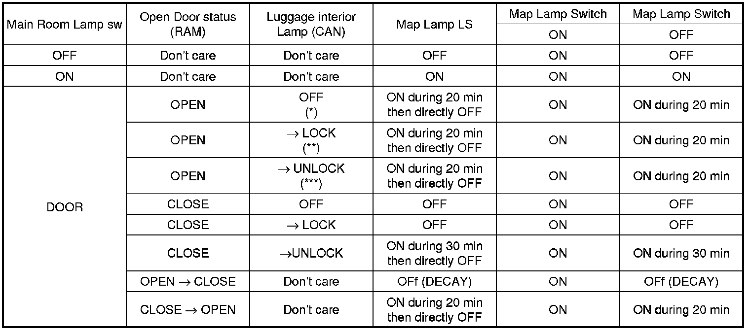 l. For the room lamps, when the 20m timer is running and any of the side doors is opened the timer is restarted.
