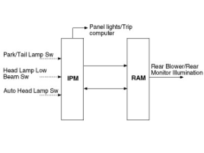 The MF "high beam" and "flash to pass" switches do not influence the management of the Panel Lights and Trip Computer illumination, Rear Blower illumination and Rear Monitor illumination.