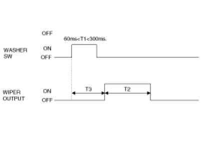 b. If the washer signal is active for T1 (between 60ms and 300ms), the rear wiper output is turned on for T2 (2.5 - 3.8 sec.), T3 (300ms) after the washer has been turned ON.