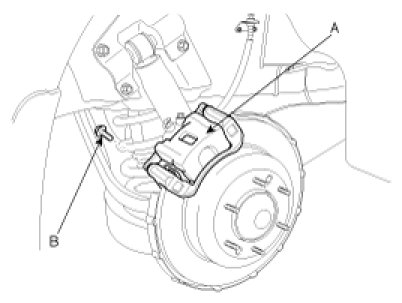 2. Remove the guide rod bolt(B), After raising the caliper assembly (A), support it with a wire.