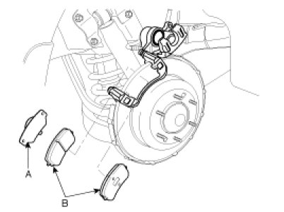 If you reuse the pads, check for foreign material between the pad shim (A) and the back of the pads (B) and reinstall the brake pads in their original position to prevent a momentary loss of braking efficiency.