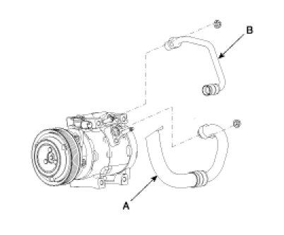 5. Remove the bolts, then disconnect the suction line (A) and discharge line (B) from the compressor. Plug or cap the lines immediately after disconnecting them to avoid moisture and dust contamination.