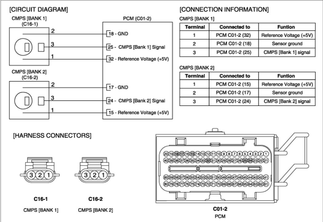 Camshaft Position Sensor (CMPS) is a hall sensor and detects the camshaft position by using a hall element. It is related with Crankshaft Position Sensor (CKPS) and detects the piston position of each cylinder which the CKPS can't detect. The two CMPS are installed on engine head cover of bank 1 and 2 and uses a target wheel installed on the camshaft. This sensor has a hall-effect IC which output voltage changes when magnetic field is made on the IC with current flow.